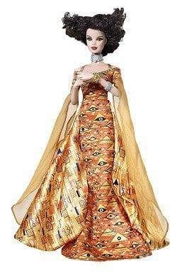 An amazing fusion of fashion and fine art, the Museum Collection dolls are a feast for the eyes! Gustav Klimt Barbie doll echoes the artist’s portrait, Adele Bloch-Bauer I, reflecting the painting’s Byzantine mosaics and Egyptian motifs. She wears a halter gown with silvery trim, draped chiffon sleeves and bustle, as well as silvery choker and cuffs, and her curly parted hair and posable hands suggest the original. She is a magnificent muse both in and out of her exquisite packaging.
